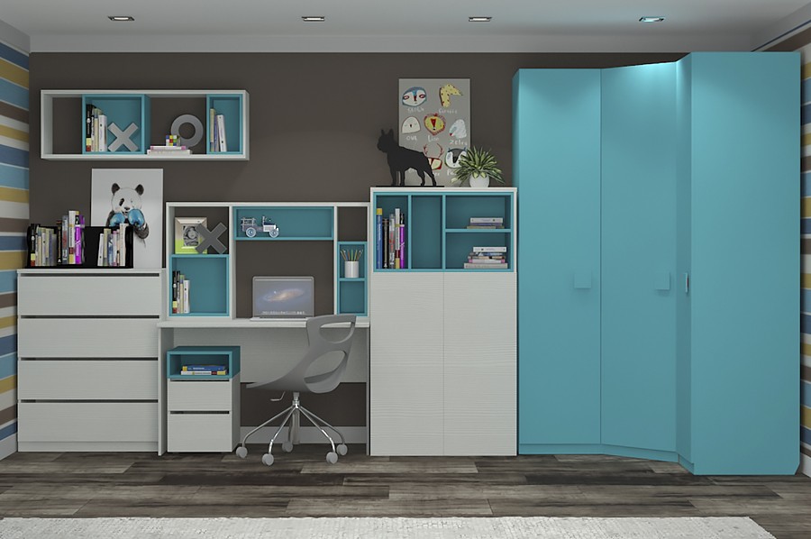 Практичная современная мебель выполнена в строгом минималистичном стиле, который обязательно придется по вкусу подросткам. Фасады оригинальной бирюзовой расцветки отлично подходят как для мальчиков и для девочек. Большое количество ящиков и открытых полок, а также объемный угловой шкаф позволят компактно разместить не только школьные принадлежности, но и детские вещи.